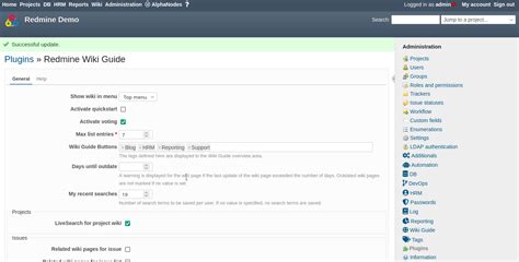 Plugin installation ¶ ↑. Now you can disable a side bar functionality of this plugin at project settings page. Here are the common steps for any plugin upgrade (all commands should be executed from the Redmine app root folder ex.