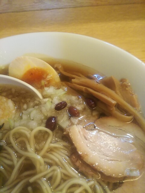 孤独のラーメン Season4あきる野編 八王子の麺処あずき 醤油らーめん 普通麺 あずきを使用した八王子ラーメンの店 澄んだ淡麗スープと刻み玉ねぎ そこに小豆と岩のり メンマとチャーシュー 麺は4種類から選べるので 迷った挙げ句ノーマルで さっぱり